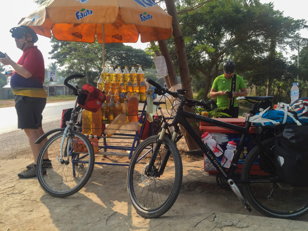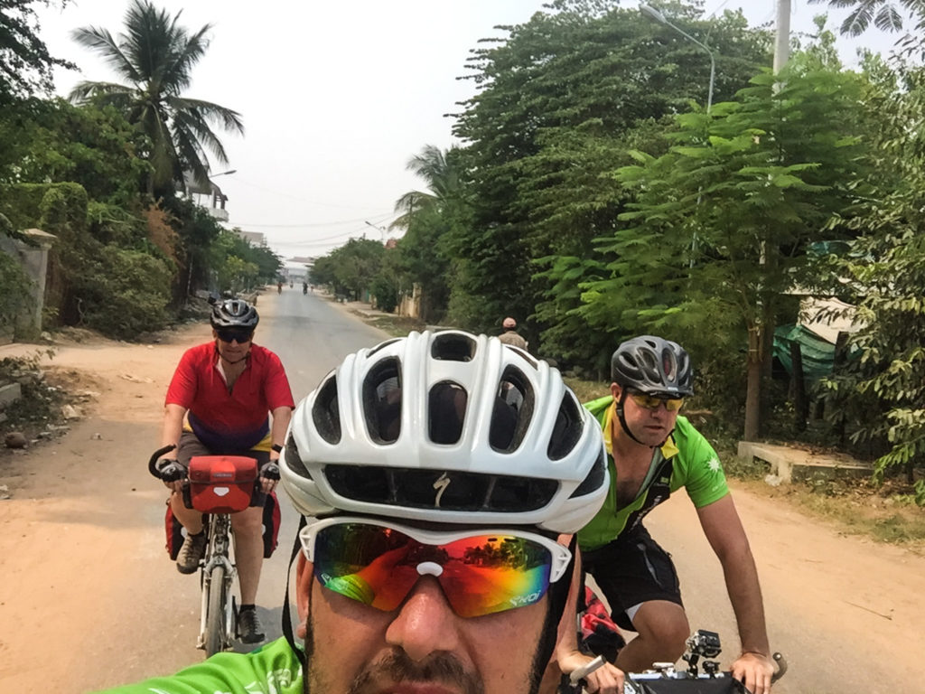 Was noch zu erwähnen wäre: Wir befuhren gestern und werden dies auch morgen tun, den National Highway 5. Und die Kambodschaner fahren wie die, entschuldigt den Ausdruck, gesenkten Säue. Einfach unfassbar. Jeder fährt wie er will. Es wird sich zwar grob an den Rechtsverkehr gehalten, aber wenn man zu dritt nebeneinander fahren kann, meist zum überholen, dann wird das auch gemacht. Es gibt auch Schilder mit Geschwindigkeitsbegrenzungen, aber die stehen halt einfach nur so rum, weil dran halten tut sich eh keiner daran. Es wird ständig gehupt, damit die Leute Platz machen, warten wäre ja blöd. Nach zwie stunden war ich echt so gereizt von der ständigen Huperei, dass kann man sich gar nicht vorstellen. Am liebten einfach ein Auto, Bus, LKW, oder was auch immer anhalten und der Karre die Hupe rausreißen… In Thailand wurde ja auch mächtig out of control gefahren, aber hier in Kambodscha ist es nochmal 3 Stufen härter. Aber was solls. Wir haben jetzt noch zwei Etappen vor uns, die werden wir auch noch gut überstehen. Nachdem wir heute ein floating Village auf dem Tonle Sap besucht haben, geht es Morgen über fast 100 km nach Kampong Chhnang und danach ncohmals in einer über 90 km Etappe in unseren Zielort Phnom Penh. Bilder vom floating Village, versuche ich morgen mit den Etappenbildern hochzuladen. Wenn wir wieder zuhause sind, wird es eh noch einen abschließenden Blogpost geben und wohl auch eine Gallery mit allen zeigewürdigen Bildern der Tour. Dazu brauche ich allerdings noch die ganzen Bilder meiner zwei Mitstreiter. Backup der Bilder wird in Phnom Penh erledigt. Dort werde ich auch die ganzen entstandenen Videos zusammenfassen. So genug für heute, es läuft Live Fußball, verstehe zwar kein Wort, aber meine Dortmunder kenne ich…